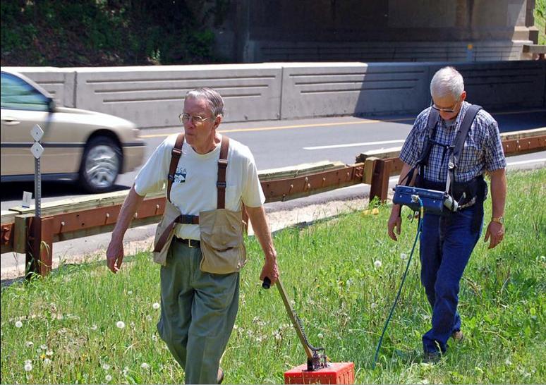 scraping soil to locate buried artifacts, as these gentlemen are doing, and flagging and recording what artifacts were