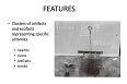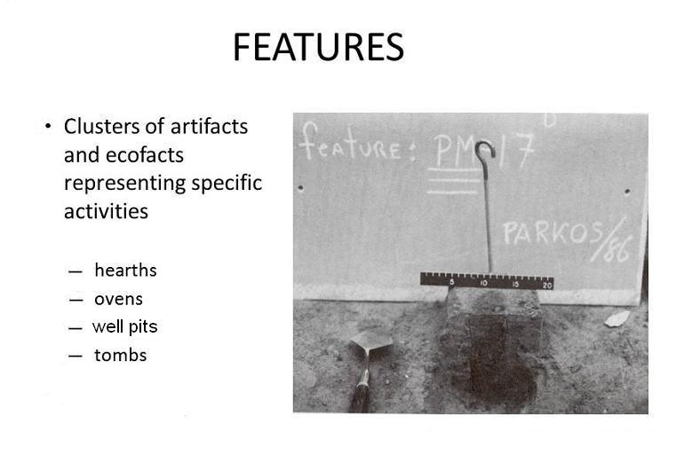 Features are clusters of items which represent specific human activities. For example, artifacts associated with a site